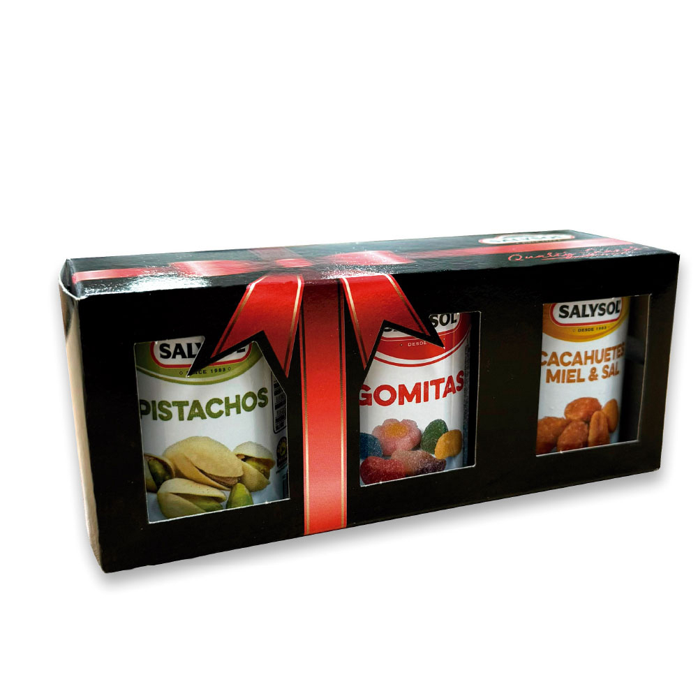 Caja de regalo cerrada a los lados con 3 latitas minibar: 2 de frutos secos variadas y 1 de gomitas.