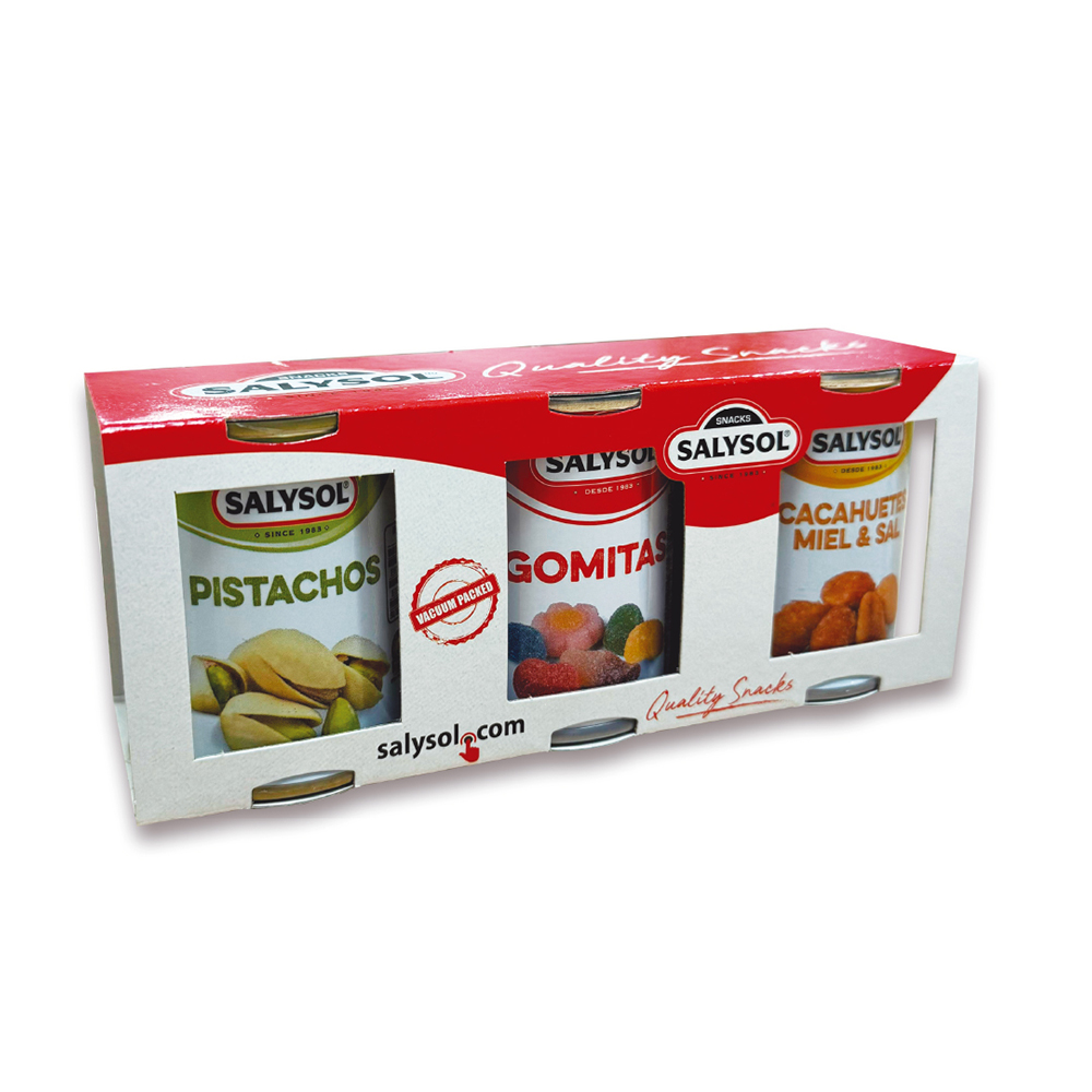 Caja de regalo abierta a los lados con 3 latitas minibar: 2 de frutos secos variadas y 1 de gomitas.
